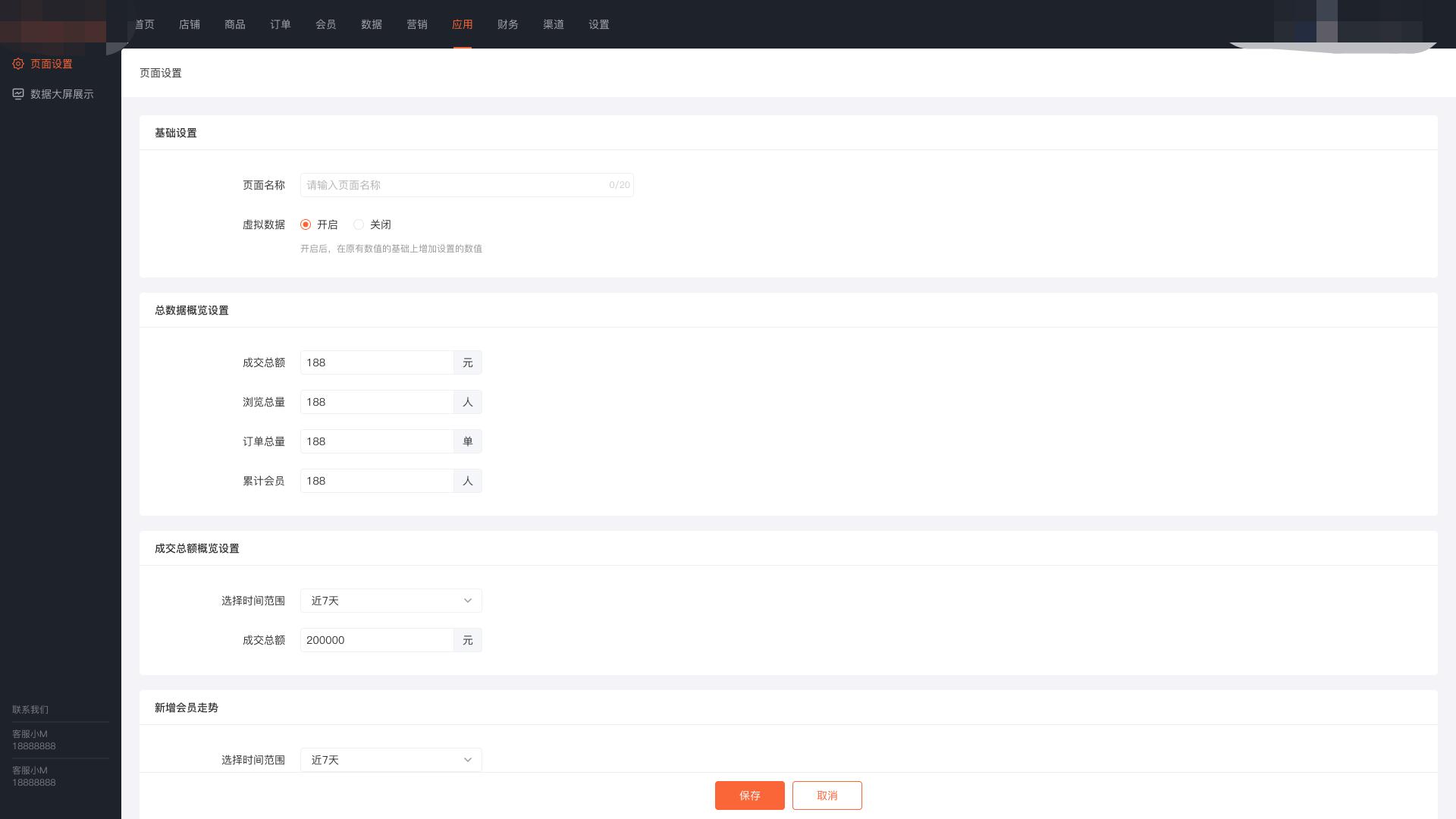 虚拟数据默认开启,开启后在原有数值的基础上增加设置的数值,例:原先店铺营业额为100元,输入50元,实际展示的营业额则为150元,关闭后各模块虚拟数据设置项隐藏。