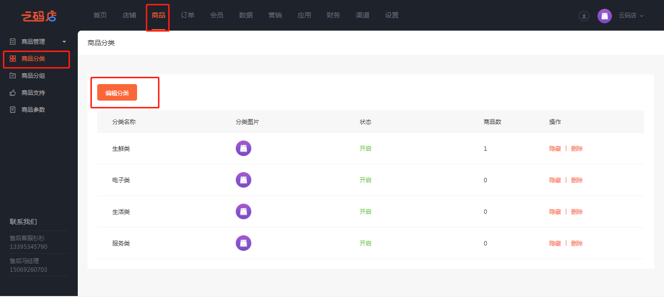 在添加商品之前需要先创建商品分类,首先点击商品,在点击商品分类,最后选择编辑分类,详情参见下图