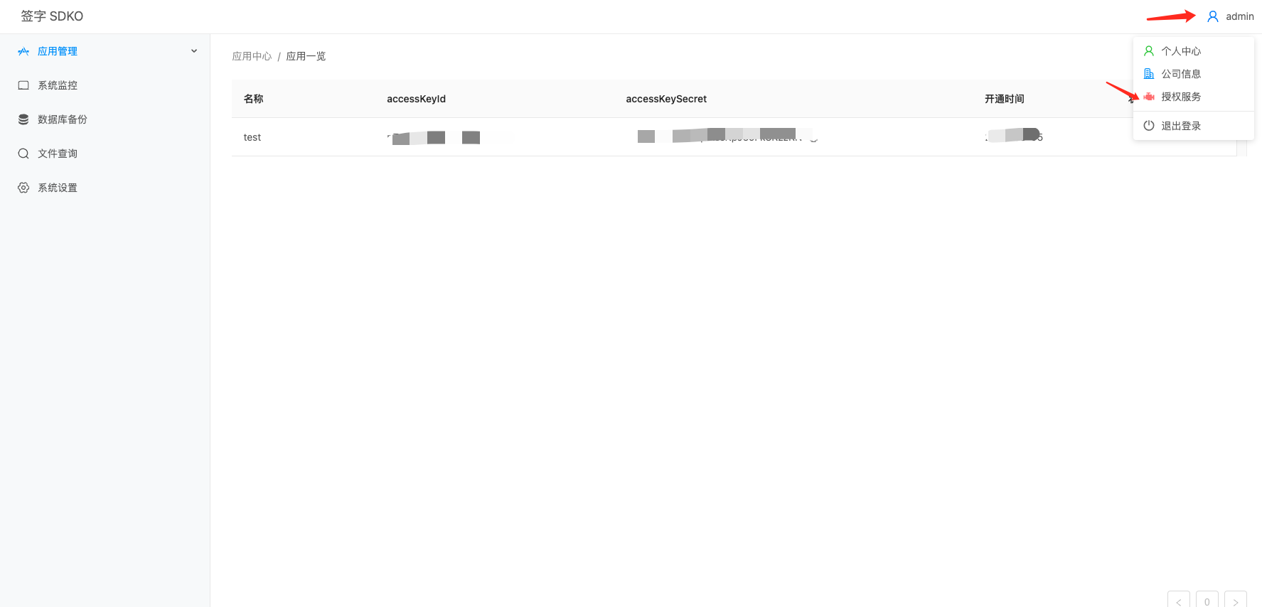 - 登录进SDK控制台,点击右上角的账号,选择授权服务选项