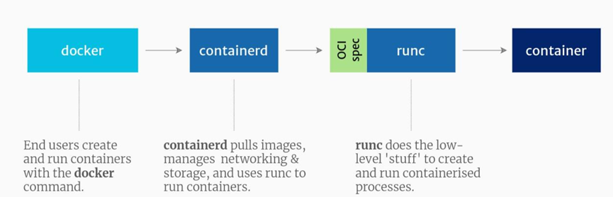 - Docker 运行一个容器是通过 Docker 守护程序、containerd 和 runc 来运行它。