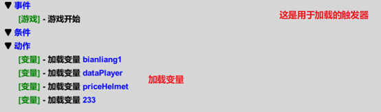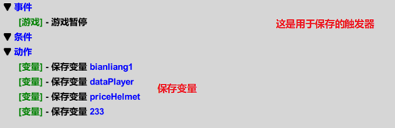 保存变量并在游戏开始时加载这部分在触发器->变量部分有讲,在这里进行比较详细的解释当游戏暂停时保存数据 游戏开始时加载变量自动定时保存变量当然,此方法还是存在一定问题的,比如直接杀后台会导致变量无法保存。你也可以不采取上面的方案,而是在变量变化时就保存,如下: