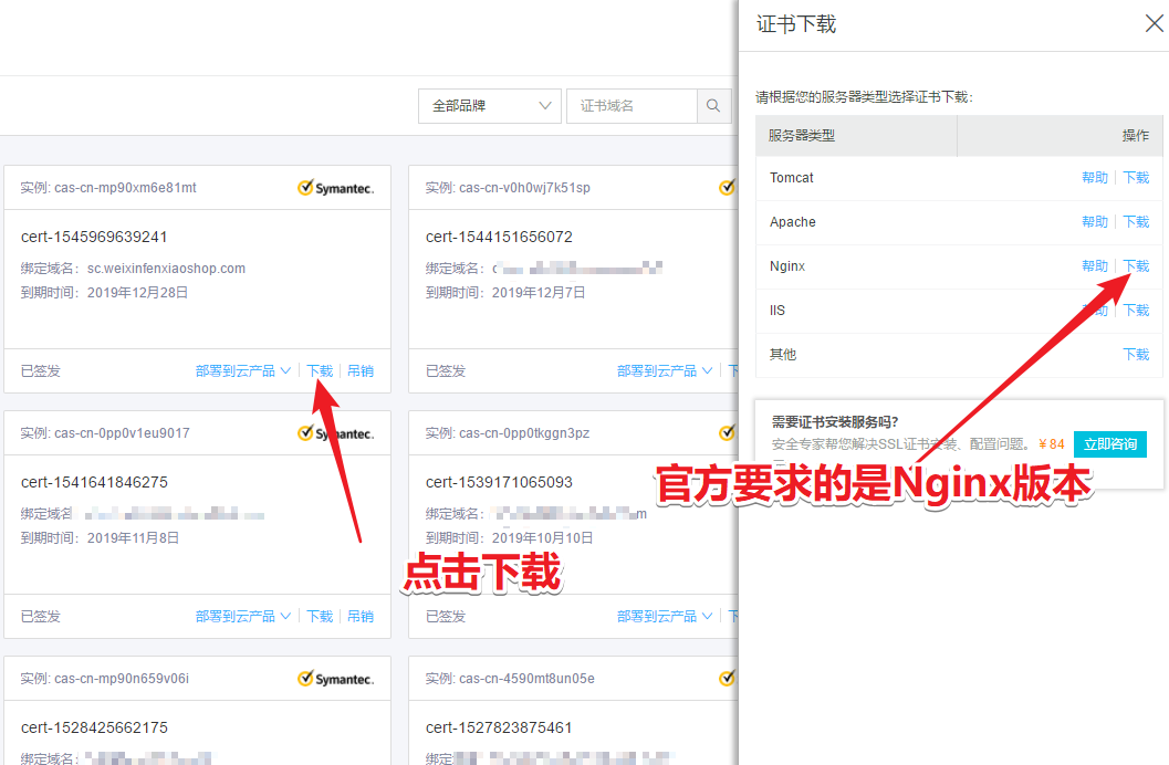 7、审核通过后,点击下载,下载类型根据您的服务器环境下载,一般官方要求是Nginx版本。如图。如果您环境是个人自行配置的,那么相关类型以您服务器环境为准。