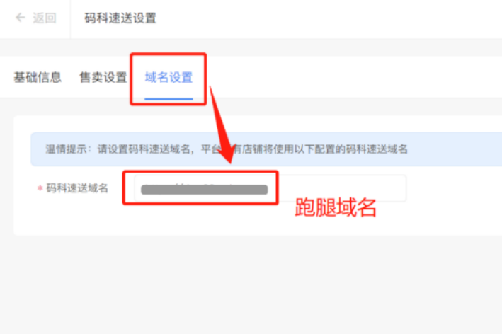 2、进入码科速送应用→域名设置→填写安装了跑腿模块的域名(域名前缀必须为https:// )