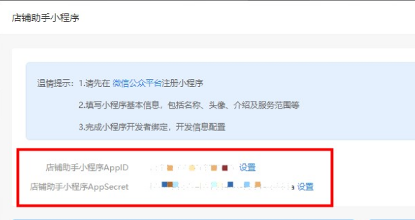 注:店铺助手小程序不可与开发小程序等使用同一个,必须是单独的小程序。