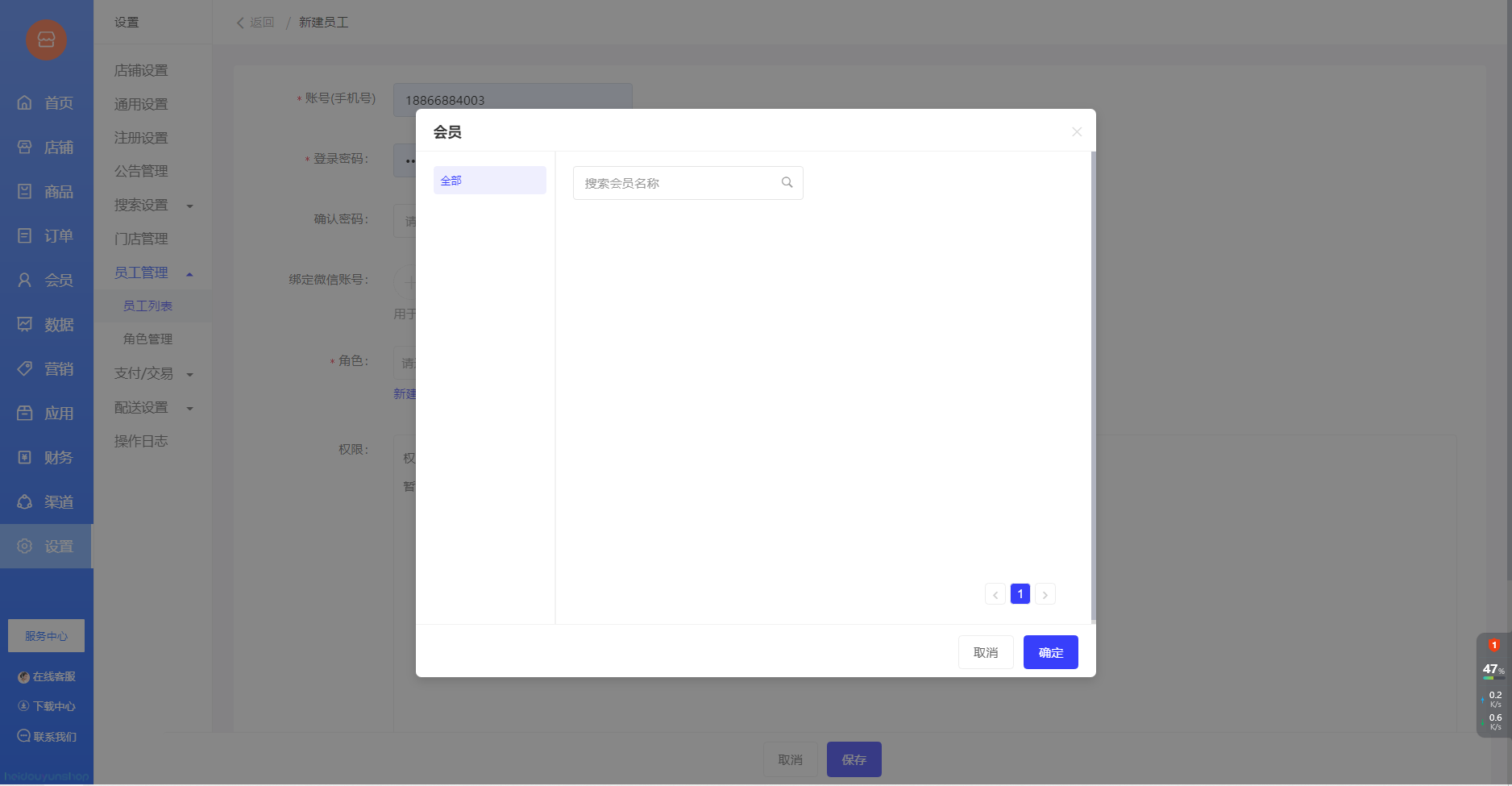 新建员工:填写员工账号密码、姓名和联系方式、选择角色等信息