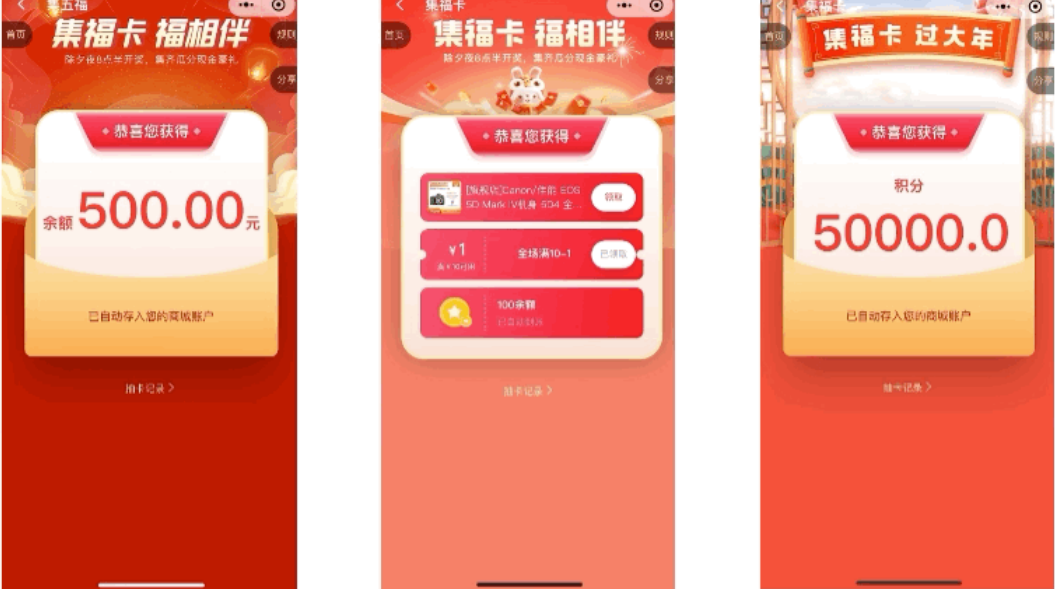 相较于其他抽奖活动,集福卡的互动性和趣味性更强,具备超强的社交属性,页面UI精美,动效丝滑。