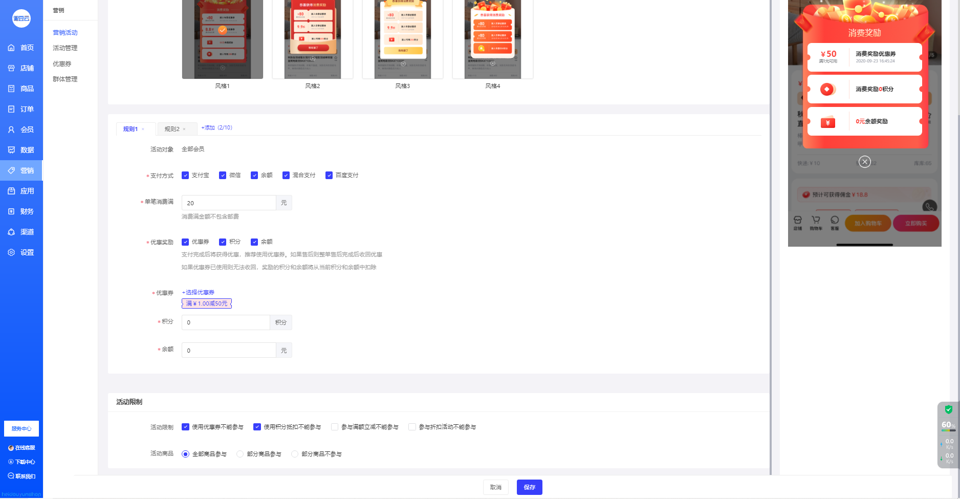 HEIDOUYUNSHOP业务端后台-营销-消费奖励