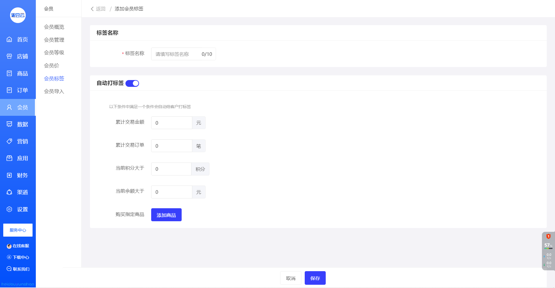 1.会员标签:展示标签名称、会员数等信息;可对标签进行编辑和删除
