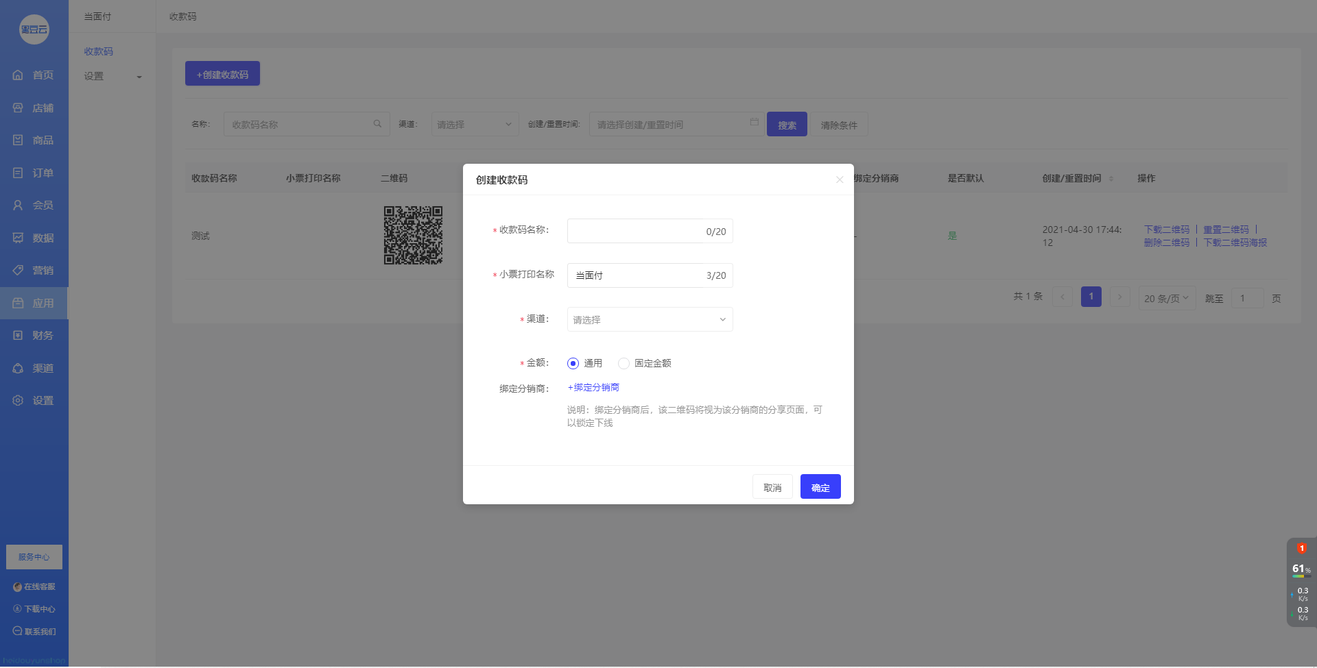 收款码还可以绑定分销商,该码将视为分销商分享出的页面行为,此项设置创建完成后将不可更改。