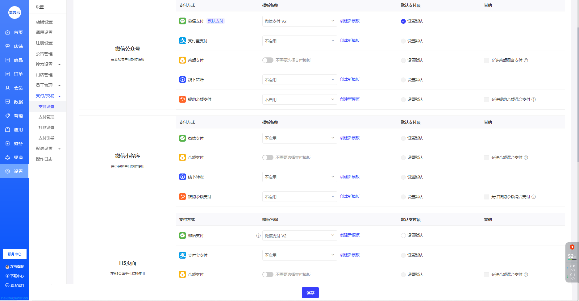 选择需要设置的商城渠道,选择创建的支付方式,选择是否开启余额支付。