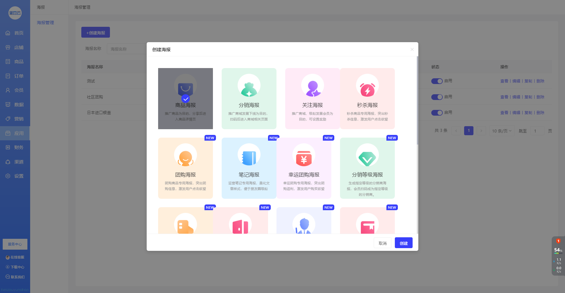 2.自定义设置海报名称以及海报的应用渠道,主要用微信公众号、小程序、APP3个渠道。若启用了公众号渠道,可选择是否强制关注公众号。(开启强制关注后,用户扫码访问海报将先跳转公众号,关注后,由公众号推送商品页。)共有三种模板提供选择,也可自定义模板。