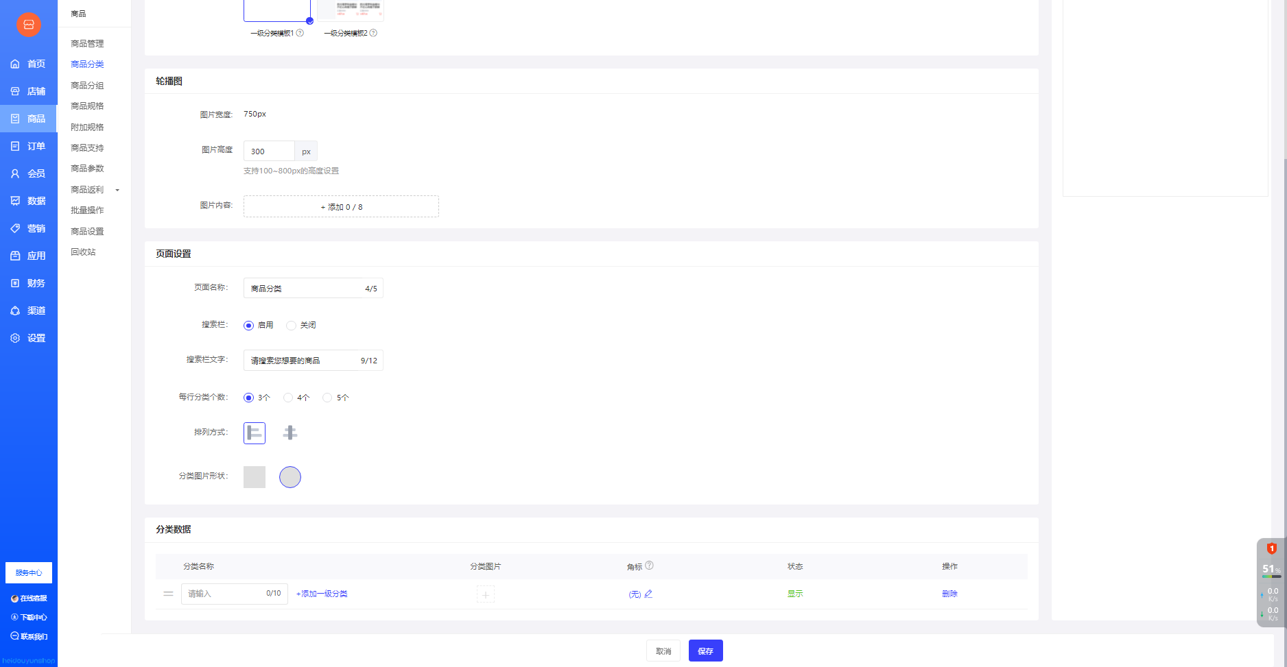 支持鼠标点击拖动分类名称调整分类位置,支持设置分类的状态:显示或者隐藏。支持设置一级分类角标,最大字数2。支持批量添加或删除轮播广告图,最多八张。