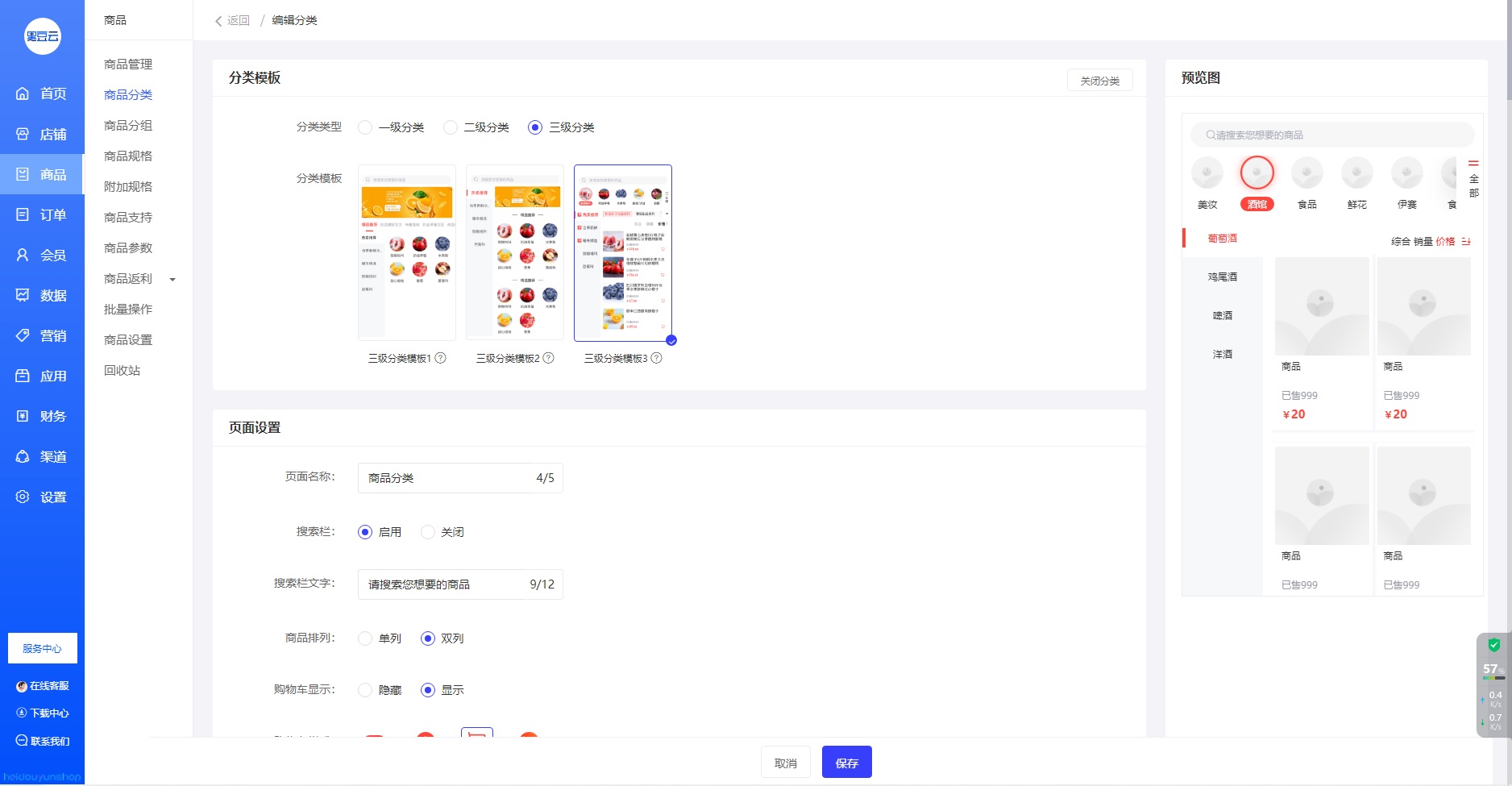 可自定义分类页面名称,设置是否启用搜索栏,自定义设置搜索栏文字,设置商品排列单双列,是否显示购物车,选择购物车样式以及点击购物车是进入商品详情页还是直接加购,更改一级分类图片形状。