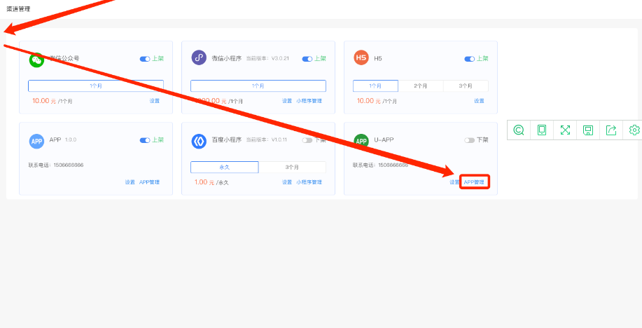 1、管理端 - 平台 - 渠道管理 - 发布渠道页面,在“U-APP”渠道部分点击“APP 管理”
