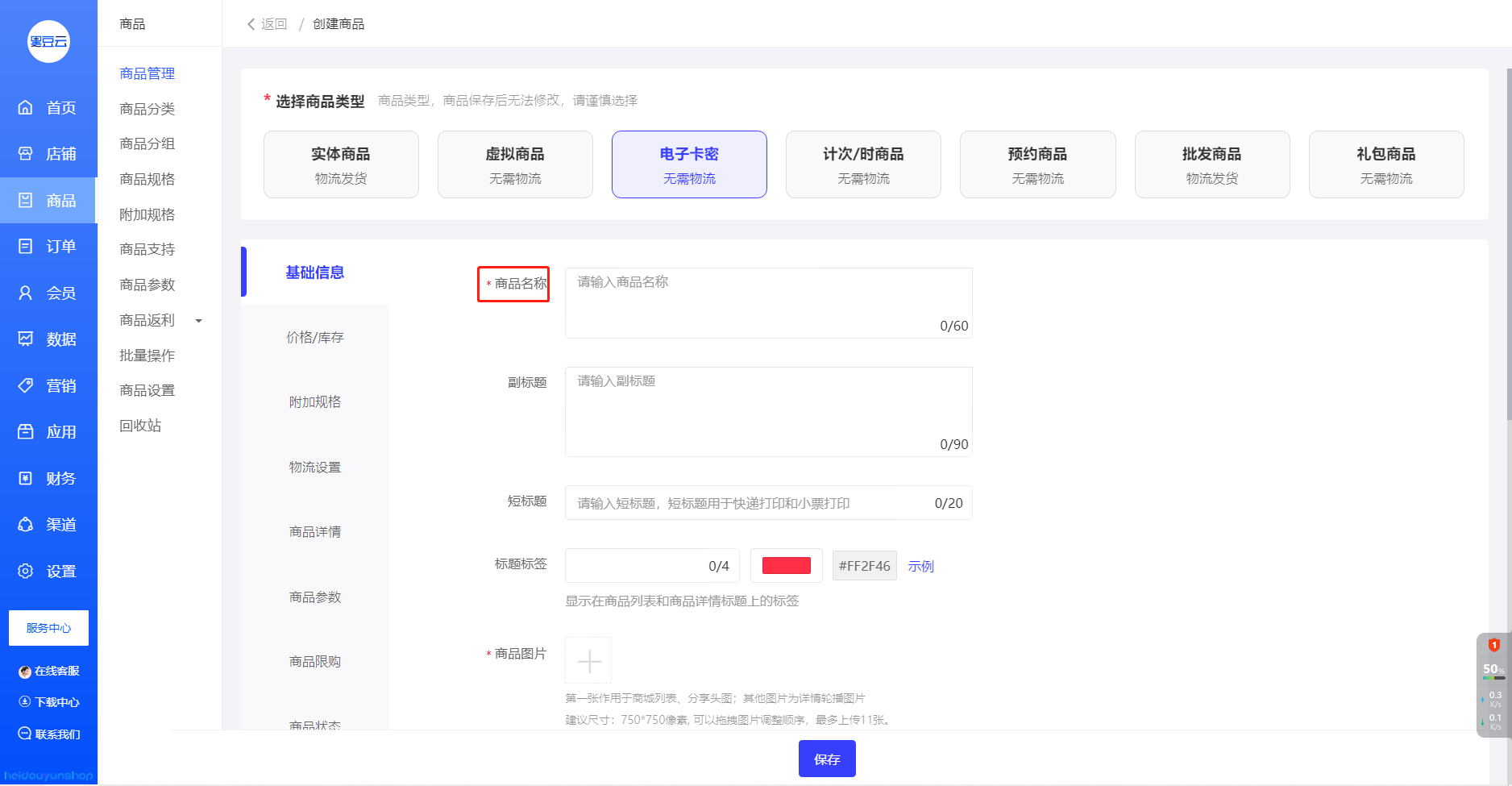添加虚拟商品也是在商品中,点击【创建商品】,商品类型选择【电子卡密】;