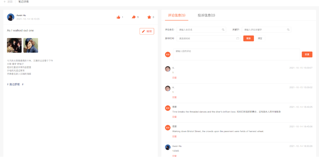 商家可在笔记详情中选择编辑从而修改笔记正文内容,可查看笔记的评论信息、投诉信息及回复评论。