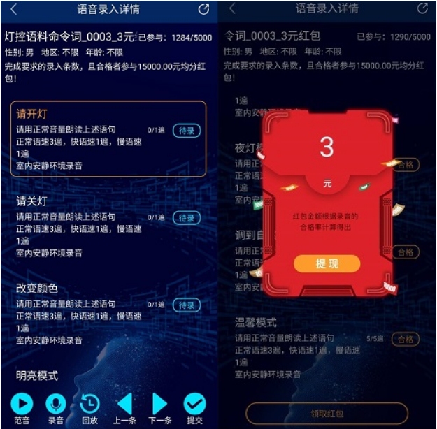 叮当语料是一个人工智能语音识别提供语料数据的APP,我们注册为会员后,可以通过录制语音,说话免费赚钱。一条语料任务单价一般在3-4元,似乎要保留1元余额,多出来钱可直接提现,亲测秒到微信零钱!这个不要求普通话一定要标准,只要平台能听懂就行!