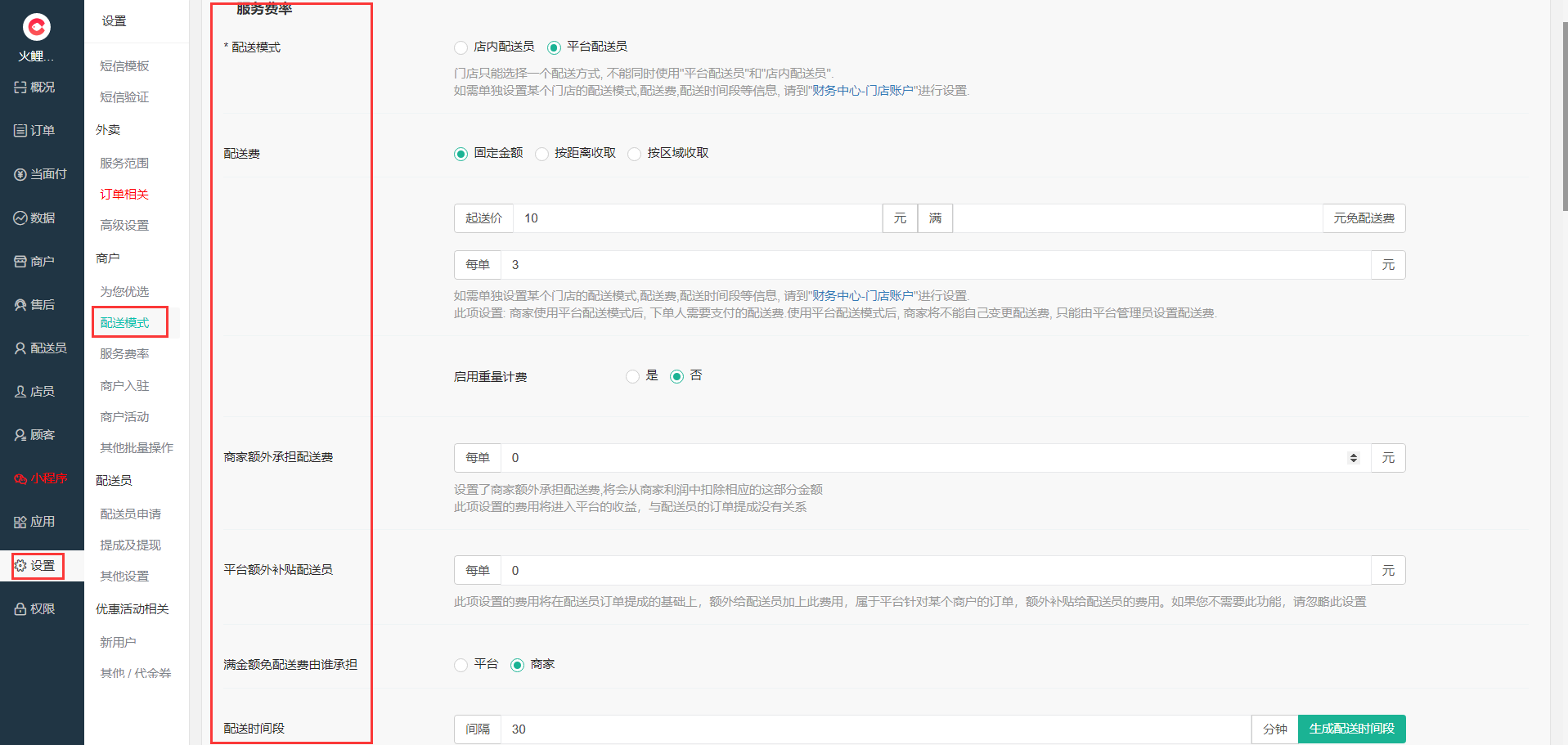 进入火鲤后台,在设置里找到配送模式,在这里可以设置平台所有商户的配送模式, 配送费及配送时间段(数字仅供参考 切勿模仿)2.还可以设置预订单的开启时间以及拼单。3.设置完以后提交保存,到这里配送相关的设置就完成了。