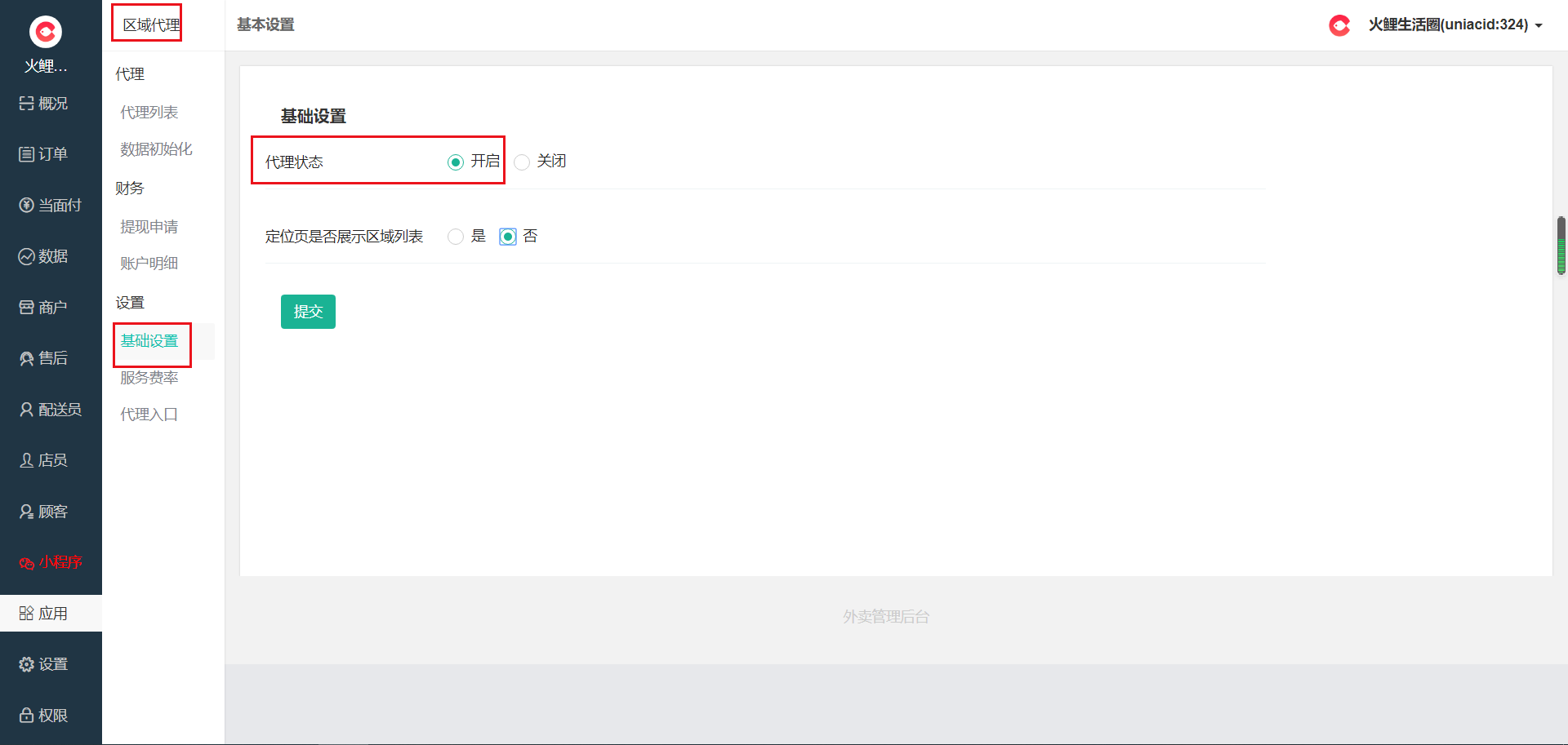 进入火鲤外卖后台,应用-区域代理进行相关设置。