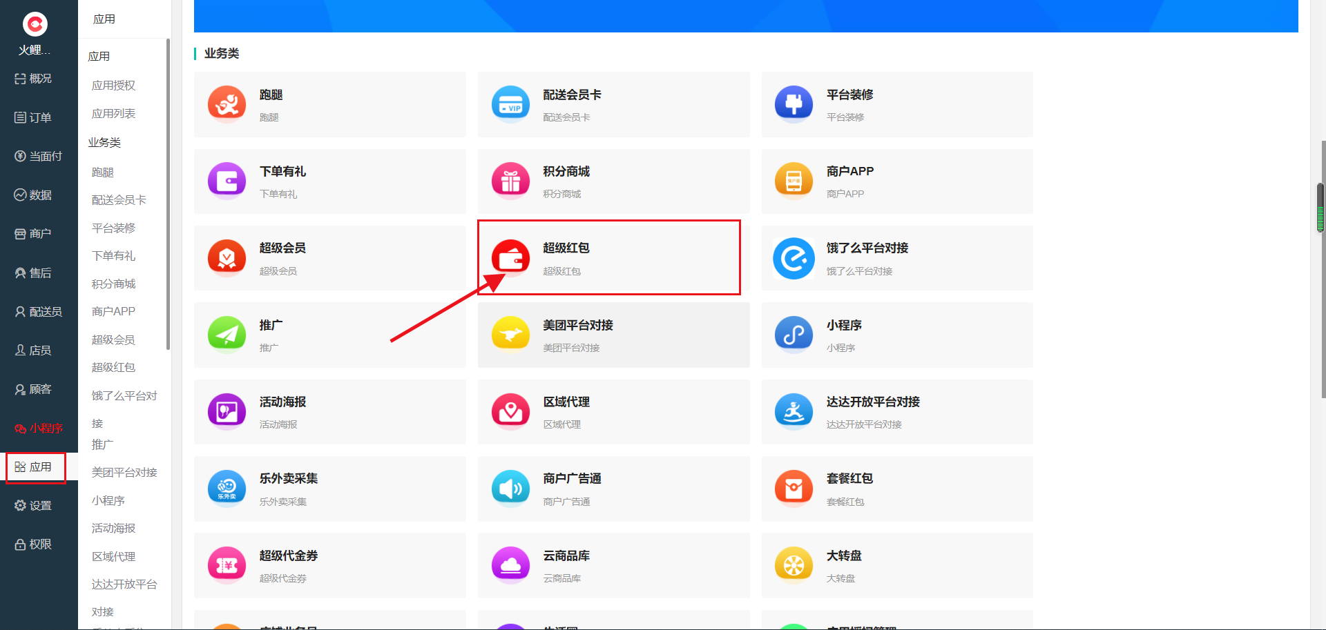 设置超级红包可以在前端首页显示首先我们需要在火鲤外卖平台应用里找到超级红包。超级红包设置好每位顾客都可以在他喜欢的商家使用。
