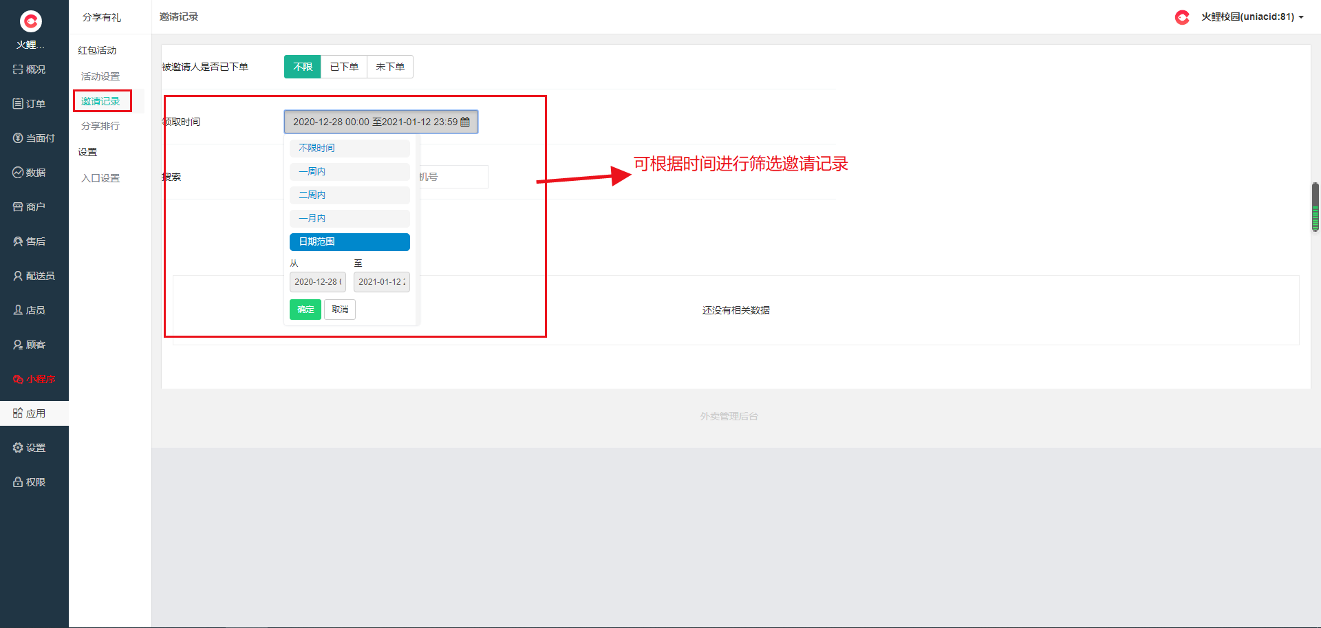 首先打开火鲤系统外卖平台点击应用—分享有礼—邀请记录