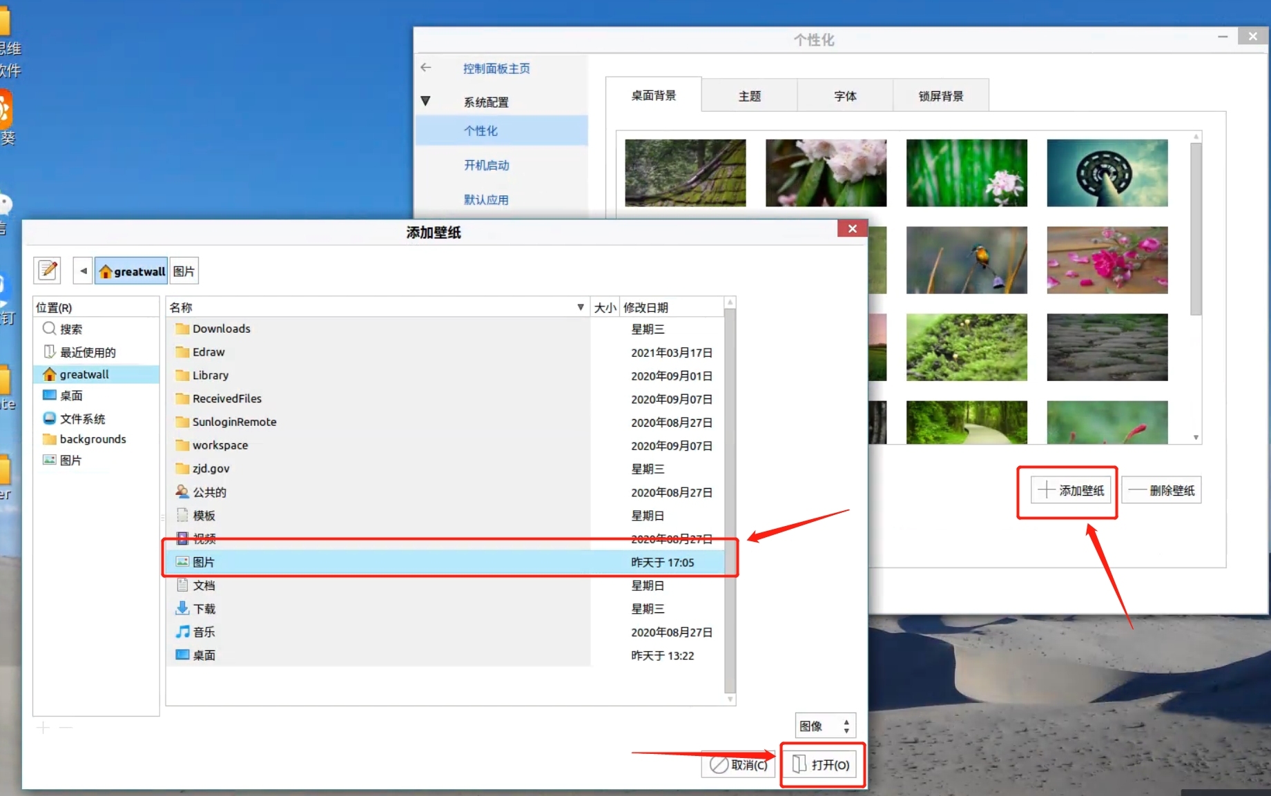 在“**个性化**”界面“**桌面背景**”中点击“**添加壁纸**”,选择电脑本地文件夹中图片,点击“**打开**”即可完成设置。