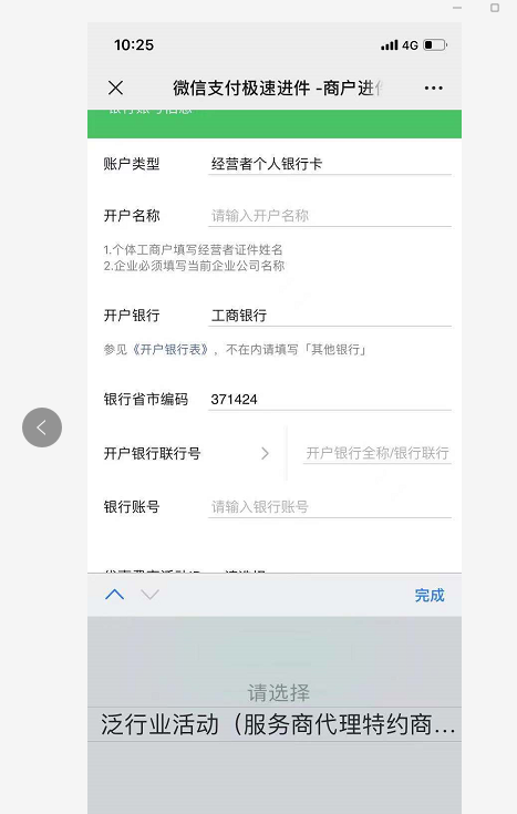 6.优惠费率选择泛行业活动(,正常微信官方申请都是0.6%的支付费率,通过黑豆科技渠道申请的,选择泛行业活动,优惠费率为0.38%)