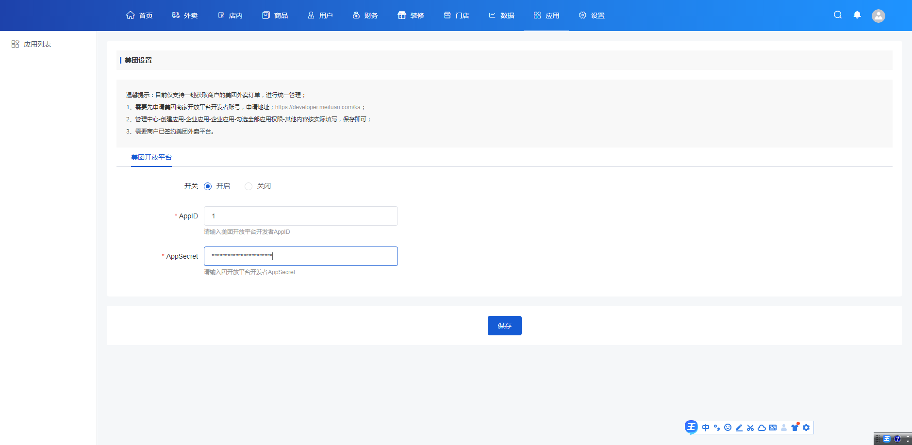 美团外卖*温馨提示:目前仅支持一键获取商户的美团外卖订单,进行统一管理; 1、需要先申请美团商家开放平台开发者账号,申请地址;[https://developer.meituan.com/ka](https://developer.meituan.com/ka); 2、管理中心-创建应用-企业应用-企业应用-勾选全部应用权限-其他内容按实际填写,保存即可; 3、需要商户已签约美团外卖平台。