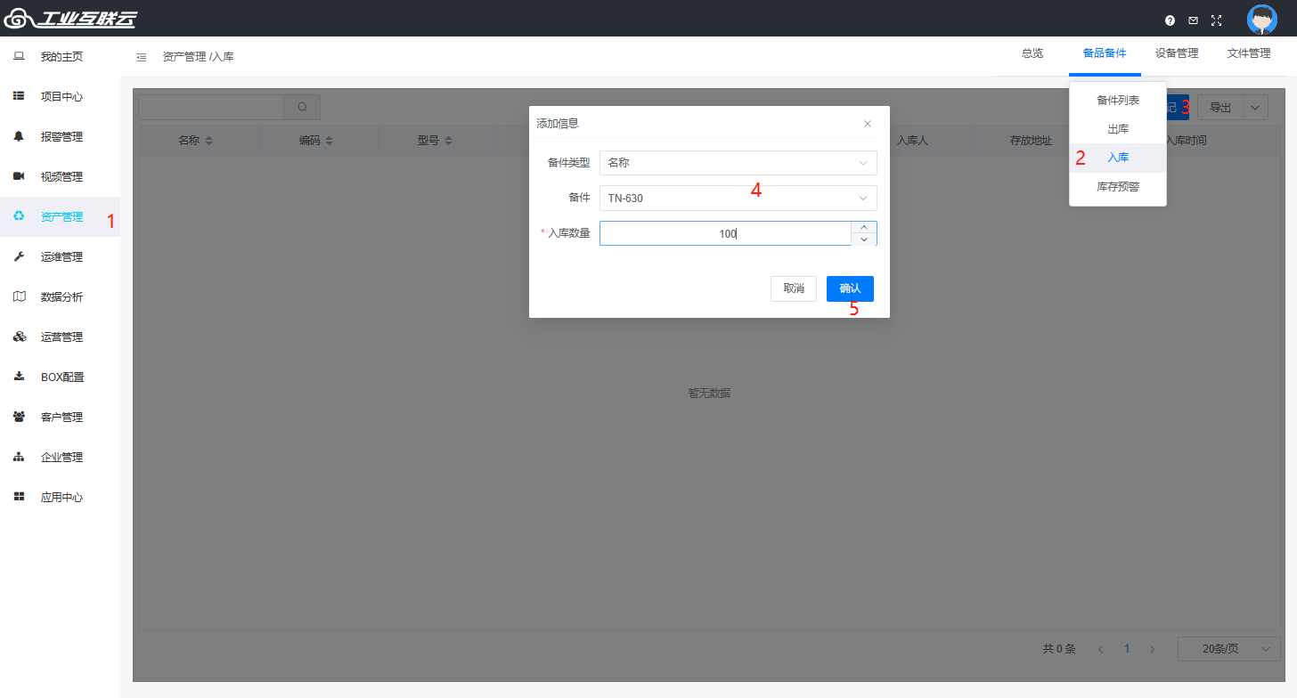 进入【项目中心】—>【资产管理】—>【备品备件】—>【入库】