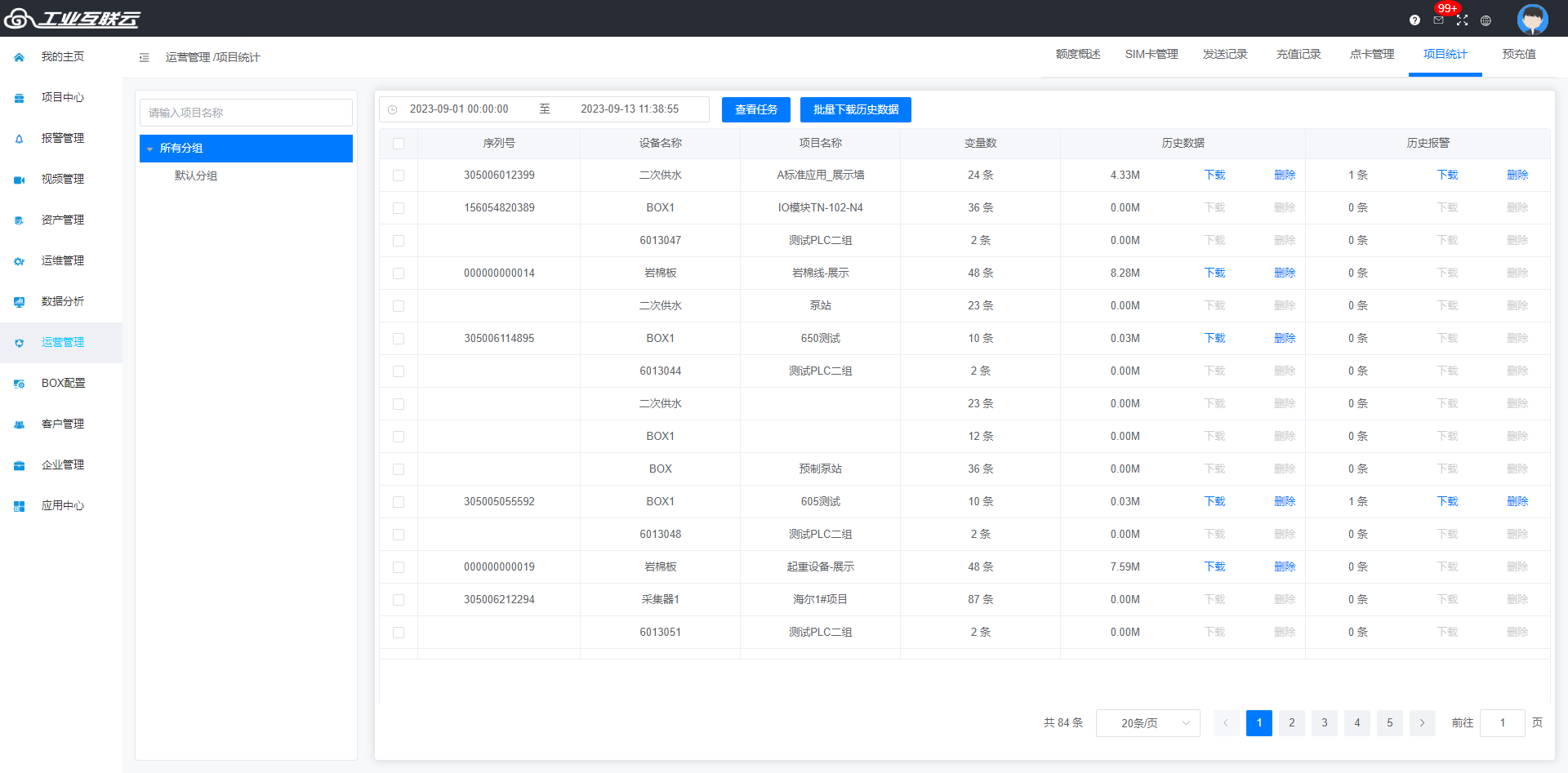 显示当前账户中有历史数据和报警的项目的存储情况,并支持查询、下载和删除。