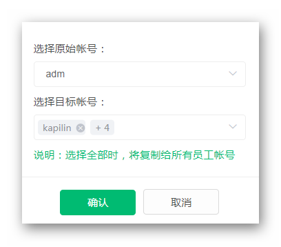 名片克隆可将一张名片上的内容,全部复制到同个企业帐号下,其他员工帐号的名片中。登陆系统PC端,点击左侧的【名片克隆】,可查看克隆记录,并根据原始帐号、目标帐号、克隆状态及时间筛选。点击右上角的【开始克隆】,选择目标帐号(可多选)与原始帐号,点击【确认】即可完成克隆。