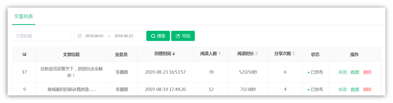 点击【文章&名片】,进入文章中心。文章中心显示一定日期内您分享的所有文章详情,包括文章ID、标题、创建时间、阅读人数、阅读时长、分享次数、状态及其他操作。可按文章标题及日期筛选并导出。