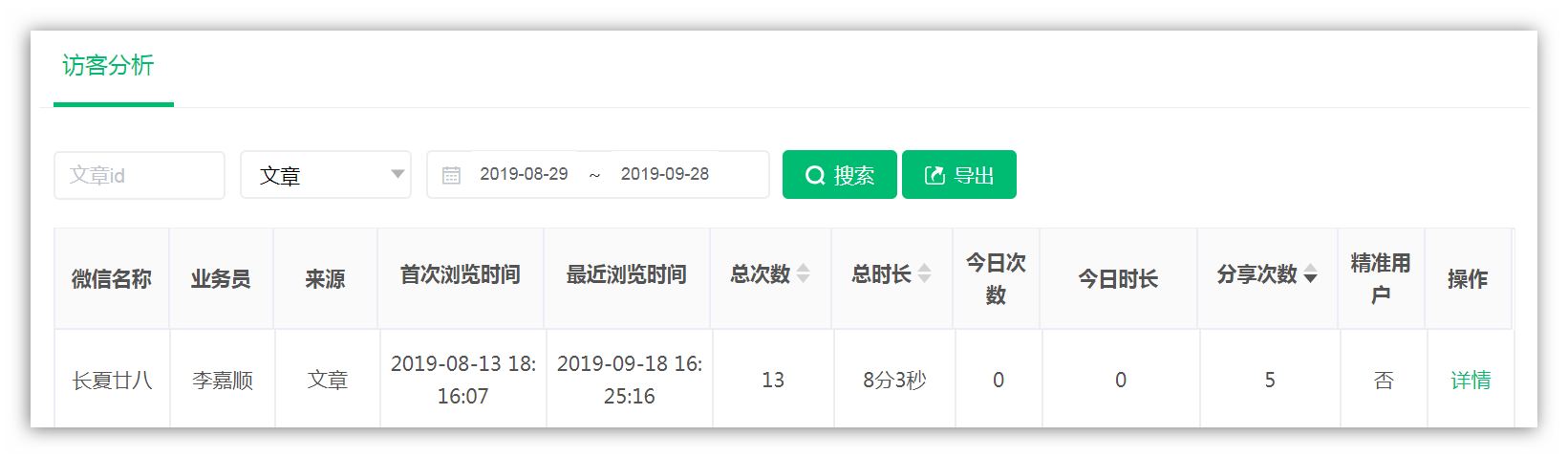 点击【访客中心】,来源选择【文章】,即可查看一定日期内所有访客的微信名称、首次&最近浏览时间,浏览总次数、总时长、今日次数、今日时长、分享次数及是否为精准用户。