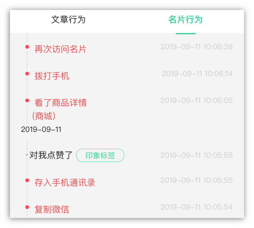 访客名片行为按时间倒序,显示名片访问、多次访问、查看商品详情、复制微信、邮箱、QQ、存入手机通讯录、点赞印象标签、授权手机号码等行为及行为时间。